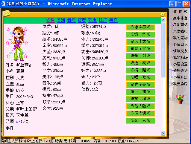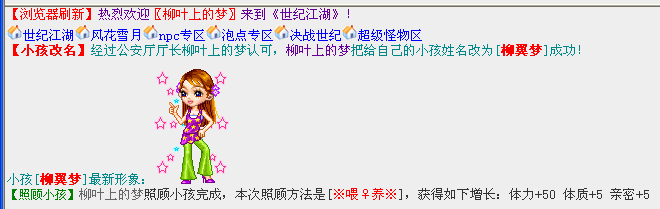 生育小孩:结婚三天后可用此命令生育小孩。在命令后面直接加上小孩的名字发言即可。此功能为女子使用,需现金大于一亿,体力大于五十万。